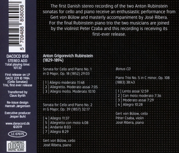 | Description: | These are the first recordings of the two sonatas for cello and piano and of the last trio for violin, cello and piano by the Russian romantic composer Anton Rubinstein. The works are performed by three fine musicians often playing together and giving a fully convincing performance of these rare works. On the re-issue of the original album a bonus album is included with the first release of the original master tape of the last Rubinstein trio, a large-scale work showing deep understanding of the chamber music combination from this big Russian.First release on LP [url=https://www.discogs.com/release/8193557]DACO 229[/url] © 1984 (Cello Sonatas)