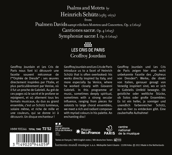 Geoffroy Jourdain und Les Cris de Paris zeigen hier eine oft verkannte Facette des â??Orpheus von Dresdenâ??: jene seiner Werke, die direkt von Italien, genauer gesagt von Venedig inspiriert sind, wo er sich in Gabrielis Umfeld bewegt hatte. Sie sind zuweilen weltlich gefärbt, und die Bandbreite der wechselnden Besetzungen reicht vom Duett bis zum groÃ?en Ensemble. Es ist ein heller, ja sonniger und unendlich farbenreicher Schütz, den es hier zu entdecken gibt in einer zauberhafte Aufnahme! - .. (PSALMI/CANTICUM CANTICORUM)? 2022 harmonia mundi s.a.s.