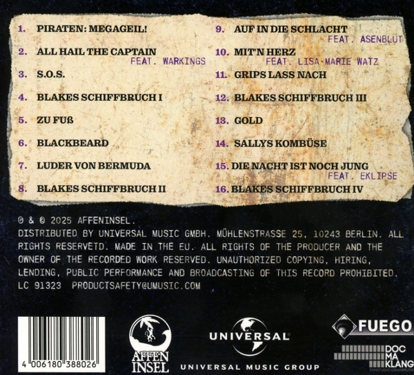 "S.O.S." is the latest CD release by Mr. Hurley & Die Pulveraffen, brought to you by Affeninsel. This energetic album takes listeners on a wild pirate adventure filled with catchy melodies, witty lyrics, and infectious rhythms that blend folk rock with maritime flair. The songs are both humorous and heartfelt, capturing tales of high seas mischief and camaraderie. Mr. Hurley & Die Pulveraffen have established themselves as one of Germany?s most beloved pirate-themed bands, known for their lively performances at festivals across Europe and chart-topping albums like "Leviathan" and "Tortuga". Their unique style combines traditional shanties with modern influences, making each track an unforgettable experience.