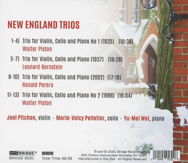 Leonard Bernsteins Trio von 1937 ist eines der frühesten Werke des Komponisten, das während seiner Lehrzeit in Harvard entstand. Seine drei Sätze sind abwechselnd tänzerisch, bluesig und jazzig. - WORKS BY BERNSTEIN/PISTON/PERERAThis recording presents four trios by American composers who are linked by their New England experience and studies at Harvard University. Three of the four works (the Piston trios and the Perera trio) are new additions to the currently available recorded catalog. Leonard Bernstein's 1937 trio is one of the composer's earliest works, written during his apprenticeship at Harvard. It's three movements are by turns dance-like, bluesy and jazzy. Violinist Joel Pitchon is active as a soloist, concertmaster and chamber music player. He has received acclaim for his performances with nationally and internationally renowned ensembles. He also works extensively in chamber ensembles. Marie-Volcy Pelletier, cellist, is a native of Paris. She received the Premier Prix in Cello and Chamber Music from the Conservatoire National de Région de Boulogne-Billancourt, France, where she studied with Michel Strauss. Yu-Mei Wei has served as piano faculty at Taipei National University of the Arts, University of Taipei, and Chihlee University of Technology. She is the winner of numerous international piano competitions and a member of two renowned chamber groups with which she has recorded five albums. |