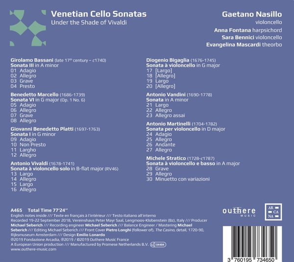 | Description: | A tireless explorer of territories off the beaten track, Gaetano Nasillo has already addressed Venetian music with a memorable album devoted to composer and 'musico di violoncello' Antonio Caldara (A356). This new album brings us back to Venice to discover cello virtuosos and sonatas between Vivaldi and Tartini. 'In the late seventeenth century the bass member of the violin family underwent an evolution to become the instrument we know as the violoncello. Within a few decades, Venice and it's republic became an important centre of composition for the new instrument, whose popularity steadily increased, reaching a peak in the 1730s and 1740s. In his recorded anthology of sonatas for the instrument the cellist Gaetano Nasillo has selected eight works by eight different composers with a connection to La Serenissima. One composer, Antonio Vivaldi, is extremely well known; two, Benedetto Marcello and Giovanni Benedetto Platti, are slightly known; the remaining five - Girolamo Bassani, Diogenio Bigaglia, Antonio Martinelli, Antonio Vandini and Michele Stratico - are hardly known at all, and this premiere recording of their sonatas reveals the high quality and simple enjoyability of their music.' - Michael Talbot |