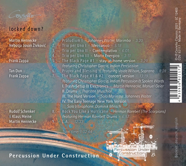 | Description: | Music For Percussion Ensemble: Locked Down? is an album by Percussion Under Construction, released in 2022. The album is a classical CD. - .. ENSEMBLE: LOCKED DOWN? / WORKS BY FRANK ZAPPA A.O.A well thought-out concept album was to be their first recorded release, the musicians of Percussion Under Construction had already decided before Corona. The forced break in the first lockdown in March 2020 strengthened them in this decision: Newly created works in this exceptional situation were to enter into correspondence with previously known ones. Thus, Prelude I, composed by ensemble member Martin Hennicke during this time, reflects the situation of the soloist left entirely to his own devices, while he revised his work L.A., begun earlier, to represent the particular consternation of the mega-metropolis: The composition, consisting partly of field recordings of industrial plants, takes on a life of it's own and continues to exist even without the temporarily invisible people. Works of the last decades partly sound in new versions, new ones were created especially for the situation of the only virtually connected actors - an impressive demonstration of different worlds of experience. |