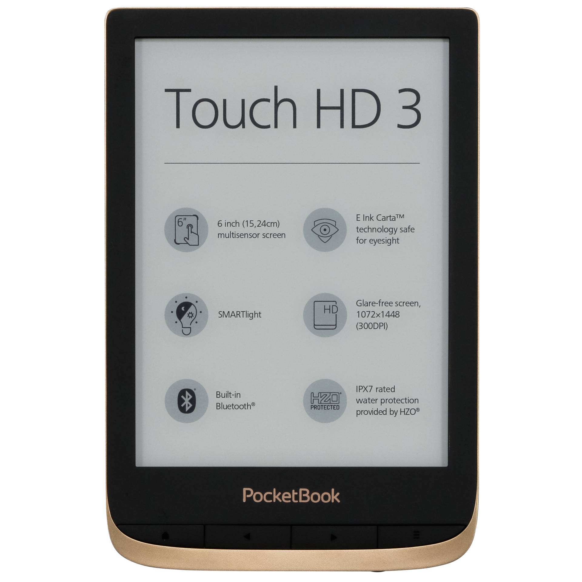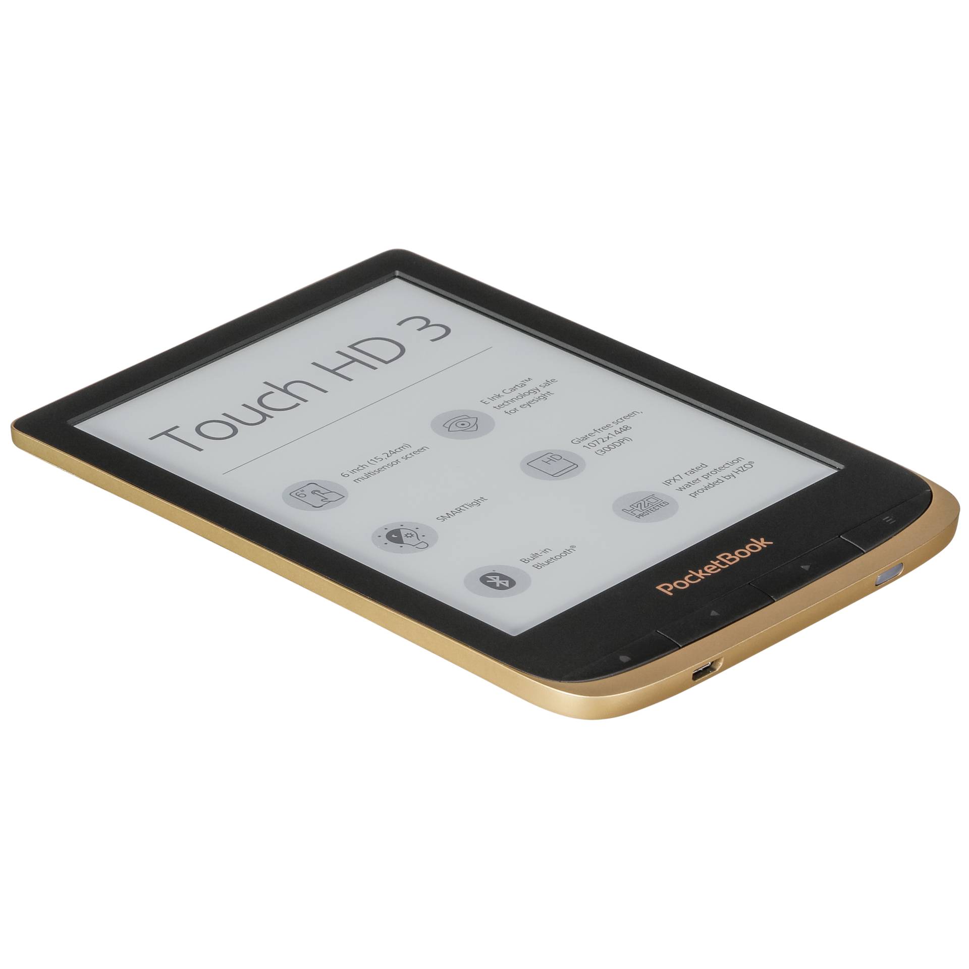 Description:PocketBook Touch HD 3 - eBook Reader - 16 GB - 15.2 cm (6") Monochrome E Ink Carta (1072 x 1448) - Touchscreen - Bluetooth, Wi-Fi - spicy copper Group Tablets and e-Book Reader Manufacturer PocketBook Manufacturer Art. Nr. PB632-K-WW Modell Touch HD 3 EAN/UPC 7640152095078 Produktbeschreibung: PocketBook Touch HD 3 - eBook-Reader - 16 GB - 15.2 cm (6") Produkttyp eBook-Reader Display 15.2 cm (6") einfarbig E Ink Carta - 1072 x 1448 - Touchscreen Prozessor (Dual-Core) Prozessor-Taktfrequenz 1 GHz Speicherkapazität 16 GB RAM 512 MB Wireless Connectivity Bluetooth, 802.11b/g/n Unterstützte Textformate FB2, EPUB, DJVU, CHM, DOCX, PDF, TXT, RTF, DOC, HTML, PRC (Mobipocket), FB2 ZIP, MOBI, ACSM, DRM, HTM Bildformate BMP, JPEG, PNG, TIFF Farbe Spicy copper